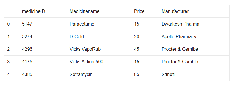 e) Draw a bar chart which represent medicine name on x-axis and its price on y-axis.