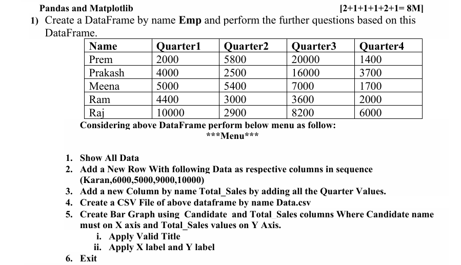 import pandas as pd import matplotlib.pyplot as plt Emp = pd.DataFrame({ 'Name': ['Prem', 'Prakash', 'Meena', 'Ram', 'Raj'], 'Quarter1': [2000, 4000, 5000, 4400, 10000], 'Quarter2': [5800, 2500, 5400, 3000, 2900], 'Quarter3': [20000, 16000, 7000, 3600, 8200], 'Quarter4': [1400, 3700, 1700, 2000, 6000] }) print(Emp) while True: print("\n*** MENU ***") print("1. Show All Data") print("2. Add New Row") print("3. Add Total_Sales Column") print("4. Create CSV File") print("5. Create Bar Graph") print("6. Exit") ch = int(input("Enter your choice: ")) if ch == 1: print(Emp) elif ch == 2: Emp.loc[len(Emp)] = ['Karan', 6000, 5000, 9000, 10000] print("New row added") elif ch == 3: Emp['Total_Sales'] = Emp['Quarter1'] + Emp['Quarter2'] + Emp['Quarter3'] + Emp['Quarter4'] print(Emp) elif ch == 4: Emp.to_csv("Data.csv", index=False) print("CSV file created successfully") elif ch == 5: plt.bar(Emp['Name'], Emp['Total_Sales']) plt.title("Employee Total Sales Report") plt.xlabel("Candidate Name") plt.ylabel("Total Sales") plt.show() elif ch == 6: break else: print("Invalid Choice")