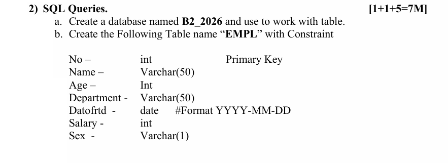 CREATE TABLE EMPL ( No INT PRIMARY KEY, Name VARCHAR(50), Age INT, Department VARCHAR(50), Datofrtd DATE, Salary INT, Sex VARCHAR(1) );