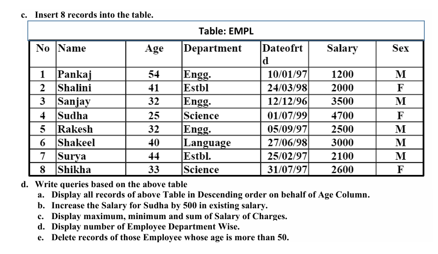 INSERT INTO EMPL VALUES (1,'Pankaj',54,'Engg.','1997-01-10',1200,'M'), (2,'Shalini',41,'Estbl','1998-03-24',2000,'F'), (3,'Sanjay',32,'Engg.','1996-12-12',3500,'M'), (4,'Sudha',25,'Science','1999-07-01',4700,'F'), (5,'Rakesh',32,'Engg.','1997-05-05',2500,'M'), (6,'Shakeel',40,'Language','1998-06-27',3000,'M'), (7,'Surya',44,'Estbl','1997-02-25',2100,'M'), (8,'Shikha',33,'Science','1997-07-31',2600,'F');