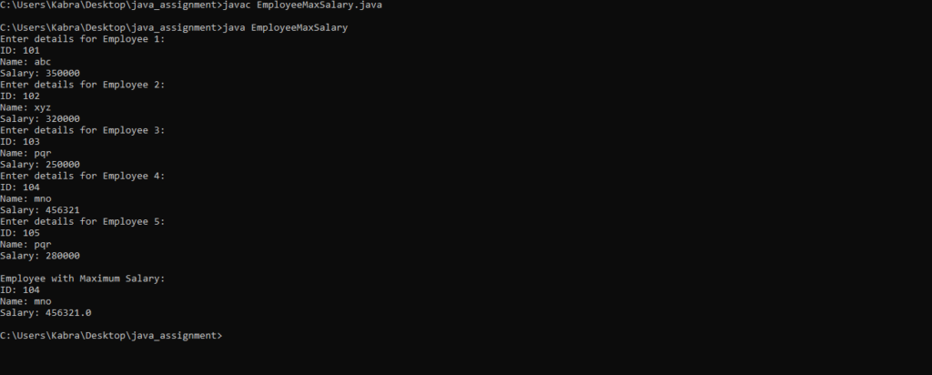 Q.11 Create class EMPLOYEE in java with id, name and salary as data-members. Again create 5 different employee objects by taking input from user. Display all the information of an employee which is having maximum salary.