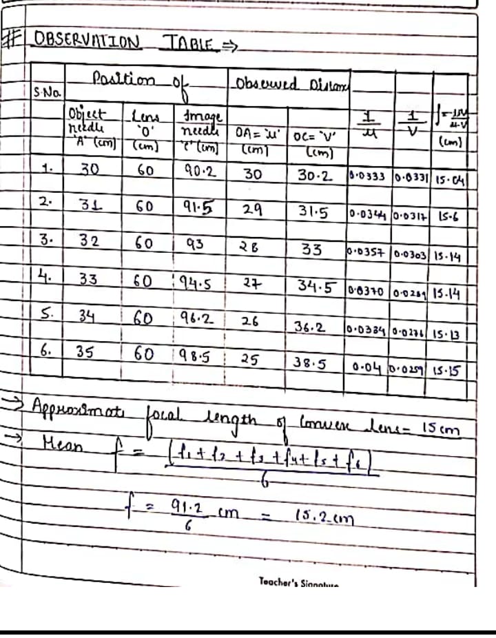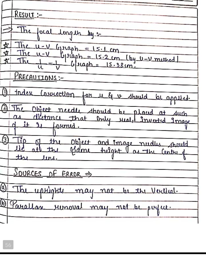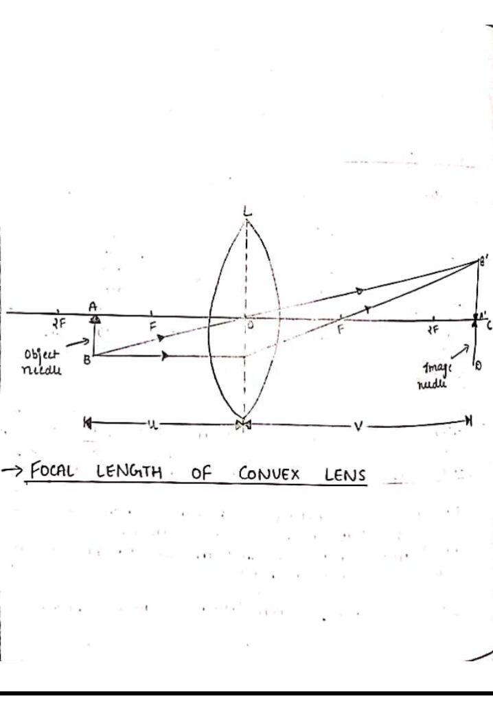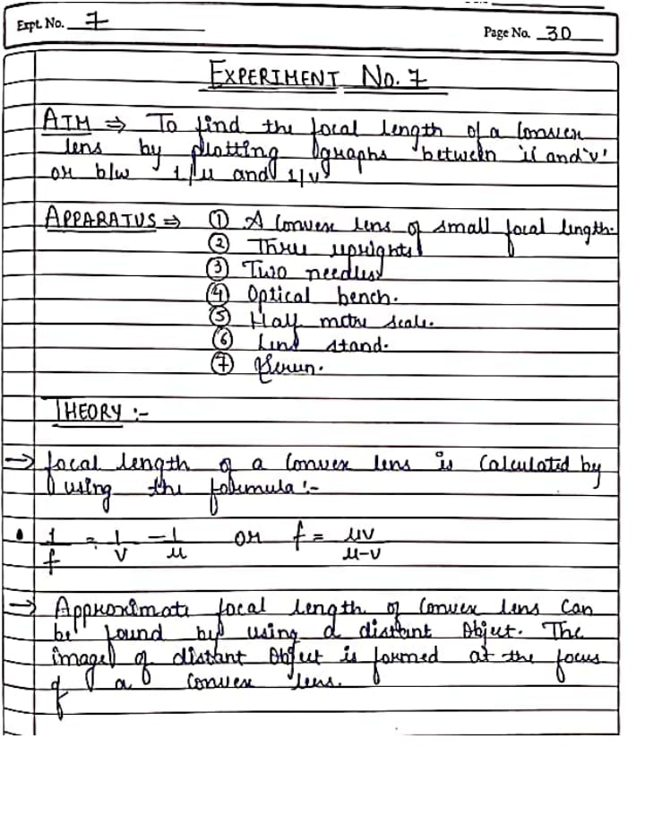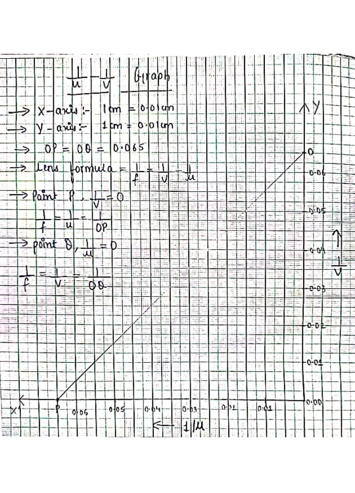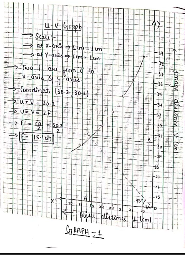 1. Find the Focal length of a Convex lens by plotting graph between object distance u and image distance v and between 1/u and 1/v.