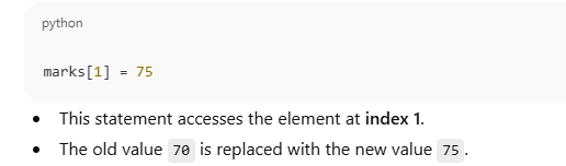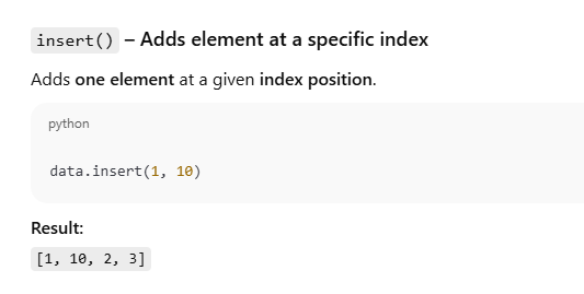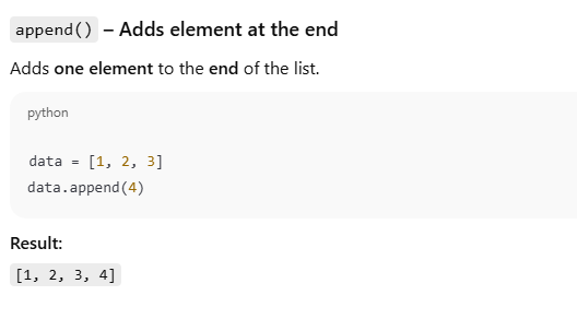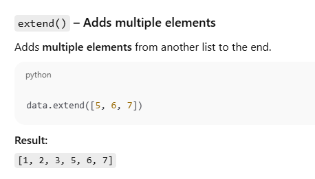 append()→ adds one element at the endinsert()→ adds one element at a specific indexextend()→ adds multiple elements