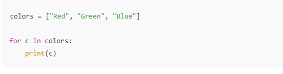 cstores the current element during each iteration.print(c)displays each color on a new line.