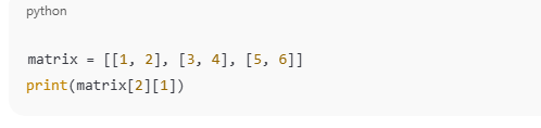 matrix[2]accesses the third inner list →[5, 6]matrix[2][1]accesses the element at index 1 of[5, 6], which is6