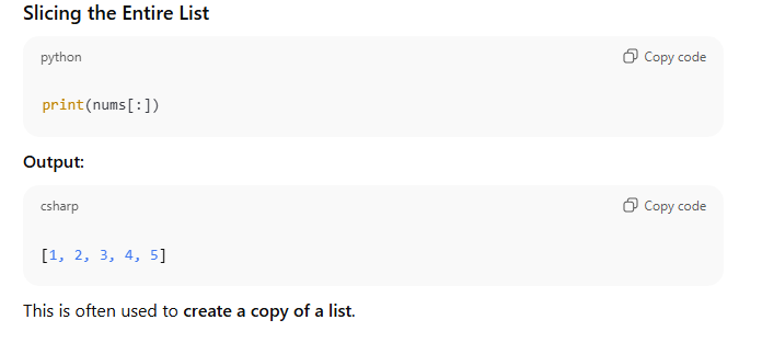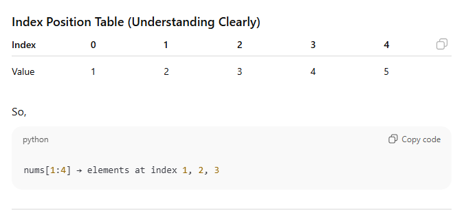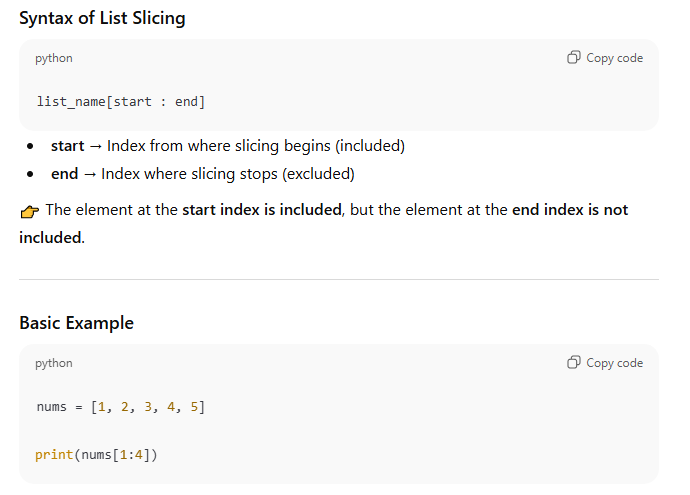 List slicing is a technique in Python used to extract a part (subset) of a list. Instead of accessing a single element using indexing, slicing allows us to access multiple elements at once by specifying a range of index positions.