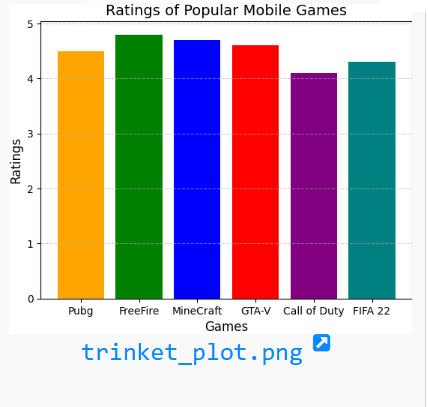 import matplotlib.pyplot as plt # Sample data games = ['Pubg', 'FreeFire', 'MineCraft', 'GTA-V', 'Call of Duty', 'FIFA 22'] ratings = [4.5, 4.8, 4.7, 4.6, 4.1, 4.3] # Plotting the bar chart plt.bar(games, ratings, color=['orange', 'green', 'blue', 'red', 'purple', 'teal']) # Adding title and labels plt.title('Ratings of Popular Mobile Games', fontsize=14) plt.xlabel('Games', fontsize=12) plt.ylabel('Ratings', fontsize=12) # Displaying gridlines for clarity plt.grid(axis='y', linestyle='--', alpha=0.6) # Displaying the chart plt.show()