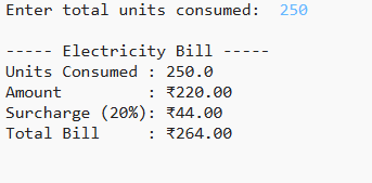# Python Program to Calculate Electricity Bill # Input the number of units consumed units = float(input("Enter total units consumed: ")) # Calculate bill according to the conditions if units <= 50: amount = units * 0.50 elif units <= 150: amount = (50 * 0.50) + ((units - 50) * 0.75) elif units <= 250: amount = (50 * 0.50) + (100 * 0.75) + ((units - 150) * 1.20) else: amount = (50 * 0.50) + (100 * 0.75) + (100 * 1.20) + ((units - 250) * 1.50) # Add surcharge of 20% surcharge = amount * 0.20 total_bill = amount + surcharge # Display the results print("\n----- Electricity Bill -----") print(f"Units Consumed : {units}") print(f"Amount : ₹{amount:.2f}") print(f"Surcharge (20%): ₹{surcharge:.2f}") print(f"Total Bill : ₹{total_bill:.2f}")