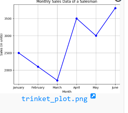 import matplotlib.pyplot as plt # Data months = ["January", "February", "March", "April", "May", "June"] sales = [2500, 2100, 1700, 3500, 3000, 3800] # Plotting the line chart plt.plot(months, sales, marker='o', color='blue', linestyle='-', linewidth=2) # Adding labels and title plt.title("Monthly Sales Data of a Salesman") plt.xlabel("Month") plt.ylabel("Sales (in units)") # Display grid plt.grid(True) # Show the chart plt.show()