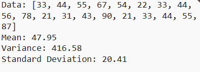 # Program to calculate variance and standard deviation # Given data data = [33, 44, 55, 67, 54, 22, 33, 44, 56, 78, 21, 31, 43, 90, 21, 33, 44, 55, 87] # Step 1: Calculate mean mean = sum(data) / len(data) # Step 2: Calculate variance variance = sum((x - mean) ** 2 for x in data) / len(data) # Step 3: Calculate standard deviation std_deviation = variance ** 0.5 # Display results print("Data:", data) print("Mean:", round(mean, 2)) print("Variance:", round(variance, 2)) print("Standard Deviation:", round(std_deviation, 2))