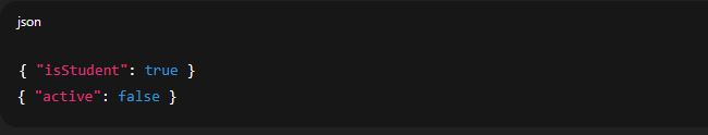 The Boolean data type is used to represent logical values and can only have two states: true or false. This type is particularly useful for representing binary conditions such as yes/no, on/off, or active/inactive states. For example, in a document, a field isStudent may store true to indicate that a person is a student, while a field active may store false to show that an account is inactive. Booleans are widely used in applications to control logic and conditional workflows.