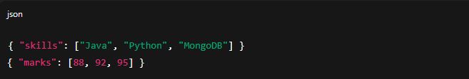 The Array data type in MongoDB is used to store multiple values in a single field. An array can contain a list of values of the same type or different types, offering flexibility in storing complex data. For example, a field skills may store ["Java", "Python", "MongoDB"], or a field marks may store [88, 92, 95]. Arrays are extremely useful for representing data that naturally exists in collections or lists, such as phone numbers, product categories, or tags associated with blog posts. They allow developers to model one-to-many relationships directly within a single document.