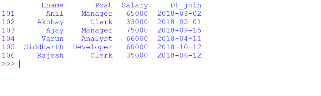 employee=pd.DataFrame(d,index=[101,102,103,104,105,106])