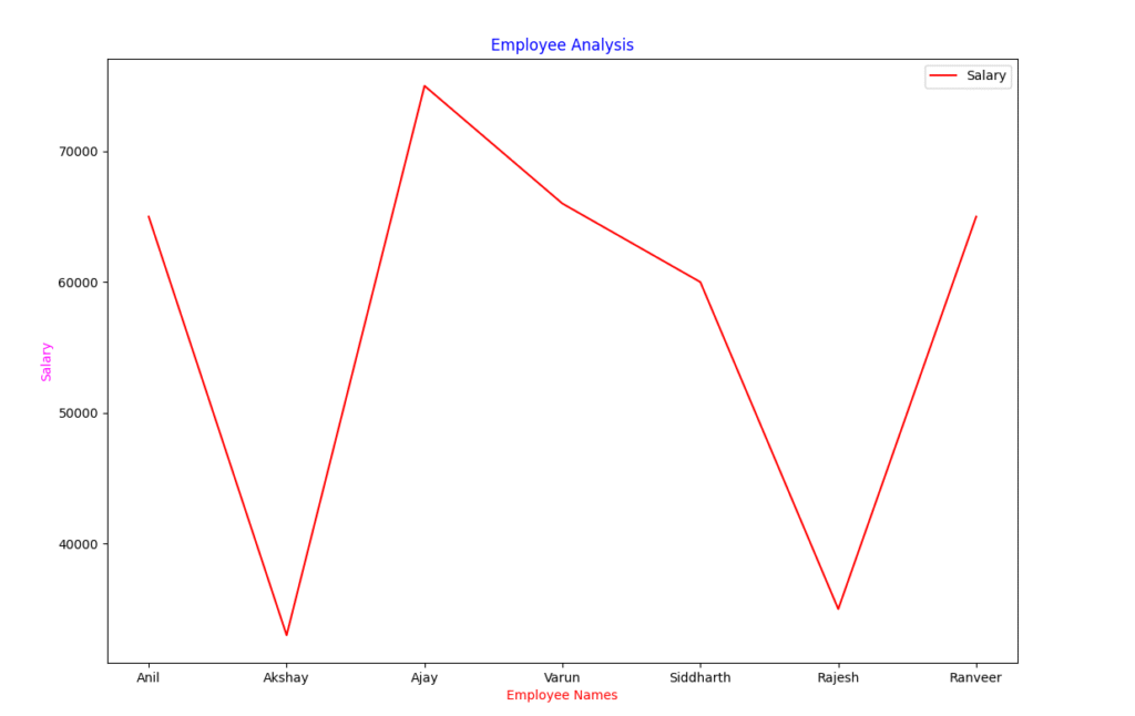 iv. Now plot a multi-line chart depicting the Employee Name on x-axis and their corresponding Salary on y-axis, with appropriate Graph title, x-axis title, y-axis title, legends and color etc.